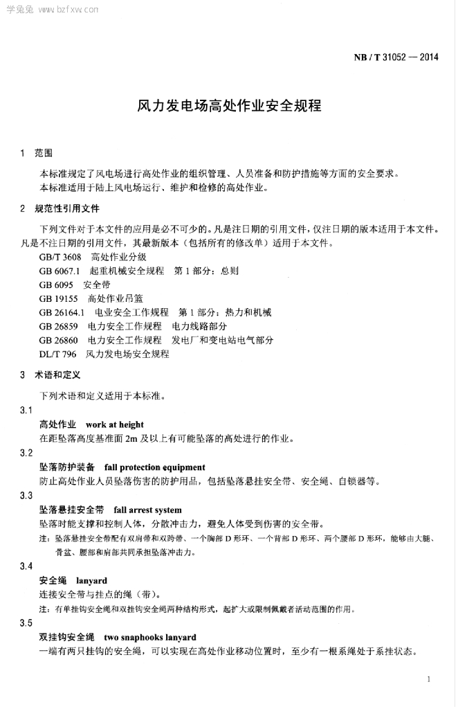 NB/T 31052-2014 风力发电场高处作业安全规程