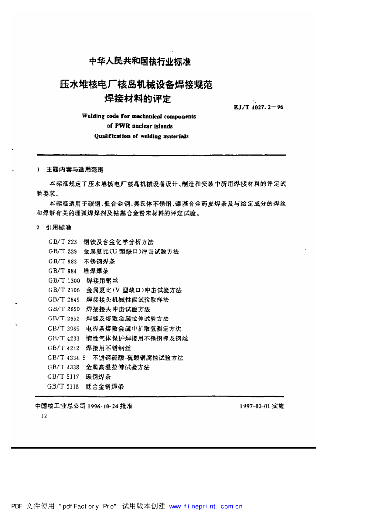 EJ/T 1027.2-1996 压水堆核电厂核岛机械设备焊接规范 焊接材料的评定