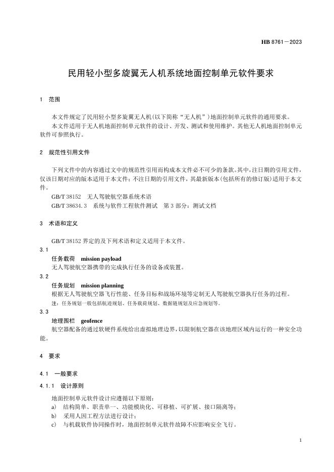 HB 8761-2023 民用轻小型多旋翼无人机系统地面控制单元软件要求