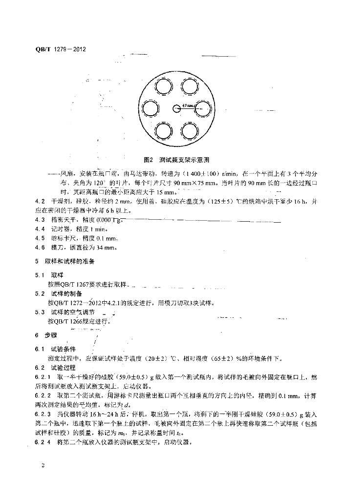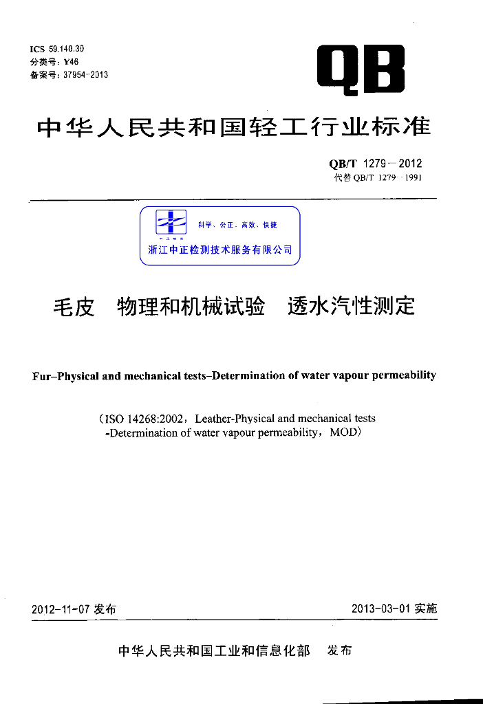 QB/T 1279-2012 毛皮物理和机械试验透水汽性测定