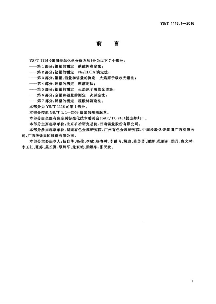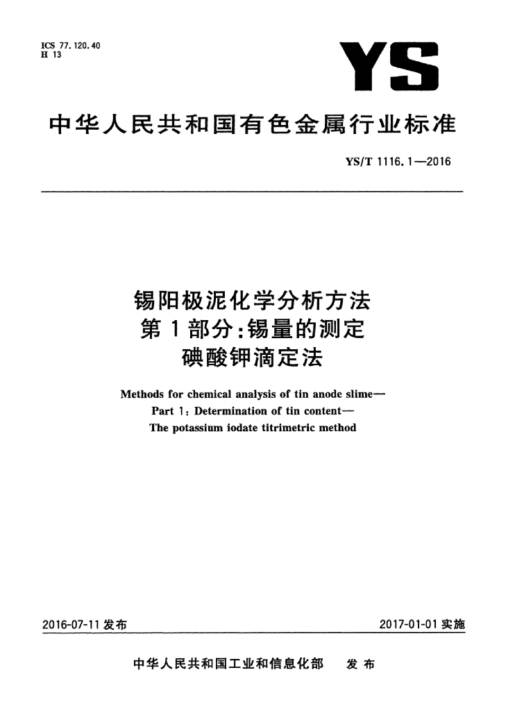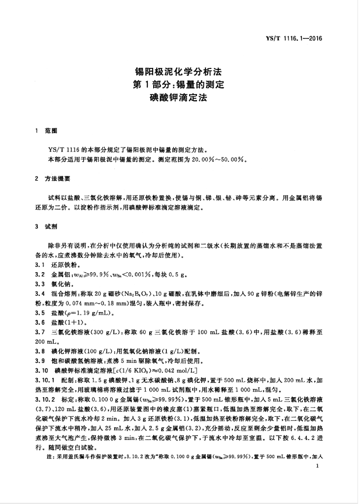 YS/T 1116.1-2016 锡阳极泥化学分析方法 第1部分:锡量的测定 碘酸钾滴定法