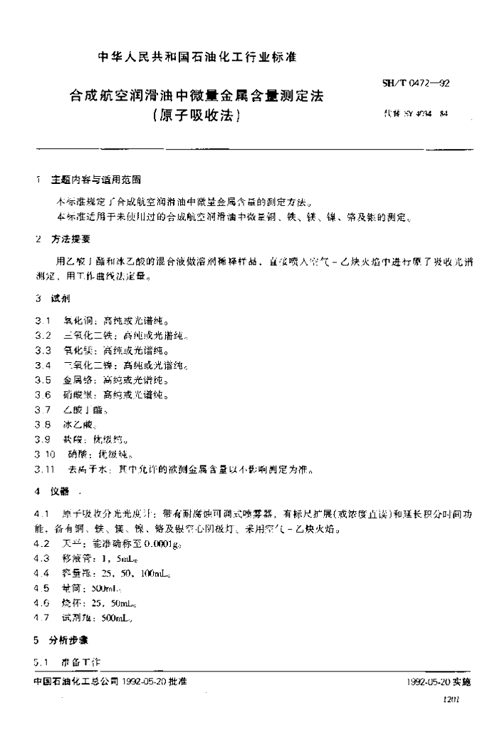 SH/T 0472-1992 合成航空润滑油中微量金属含量测定法(原子吸收法)