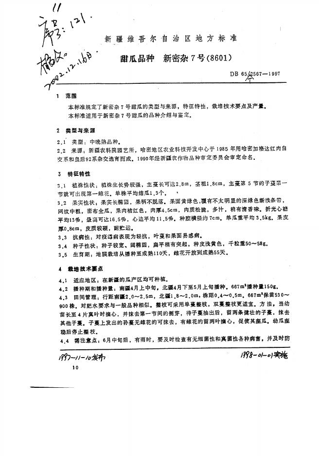 DB65/T 2567-1997 甜瓜品种 新密杂7号