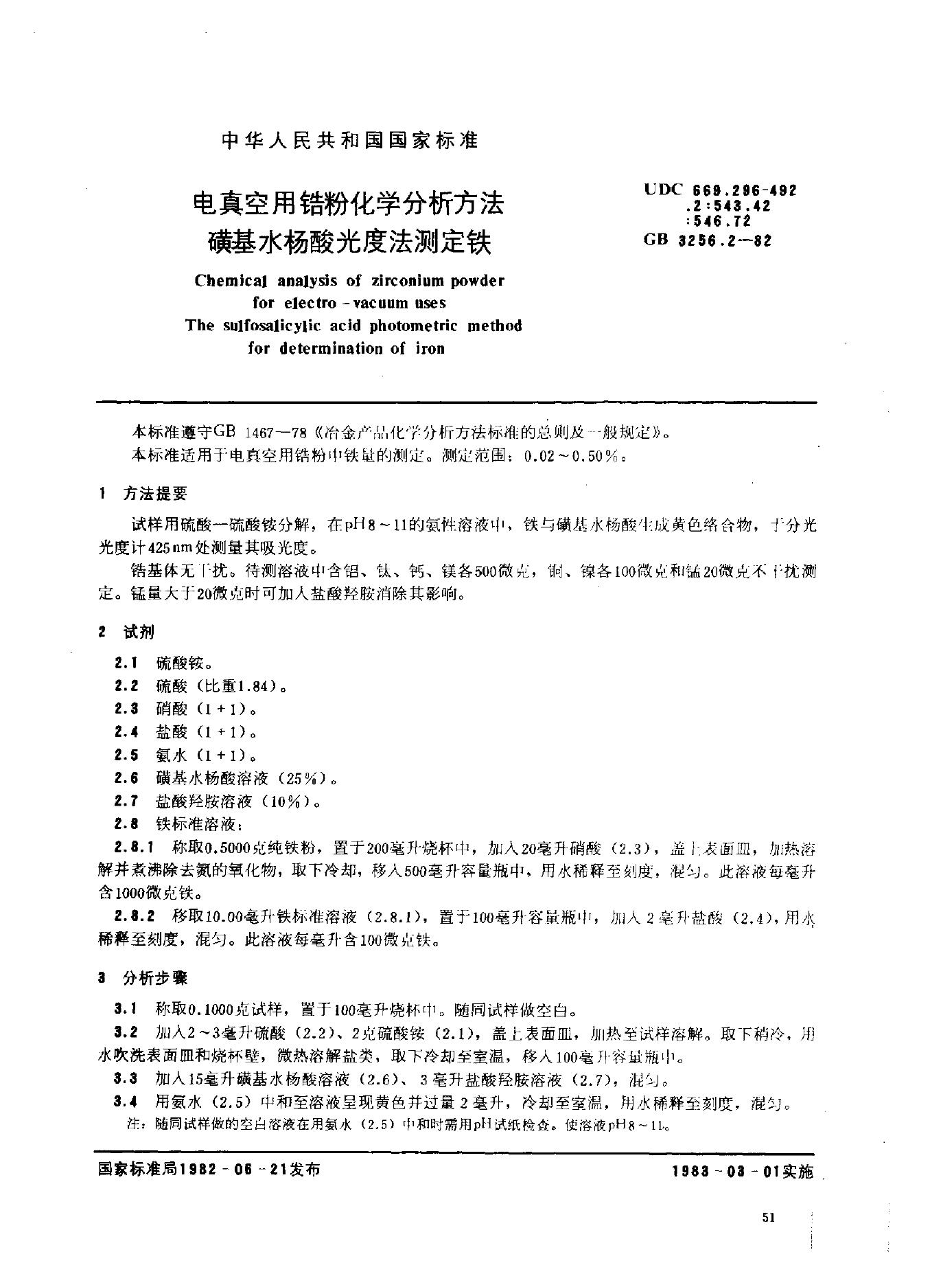 GB/T 3256.2-1982 电真空用锆粉化学分析方法 磺基水杨酸光度法测定铁