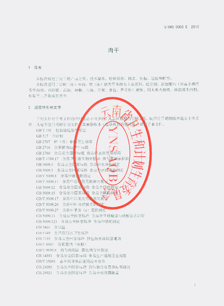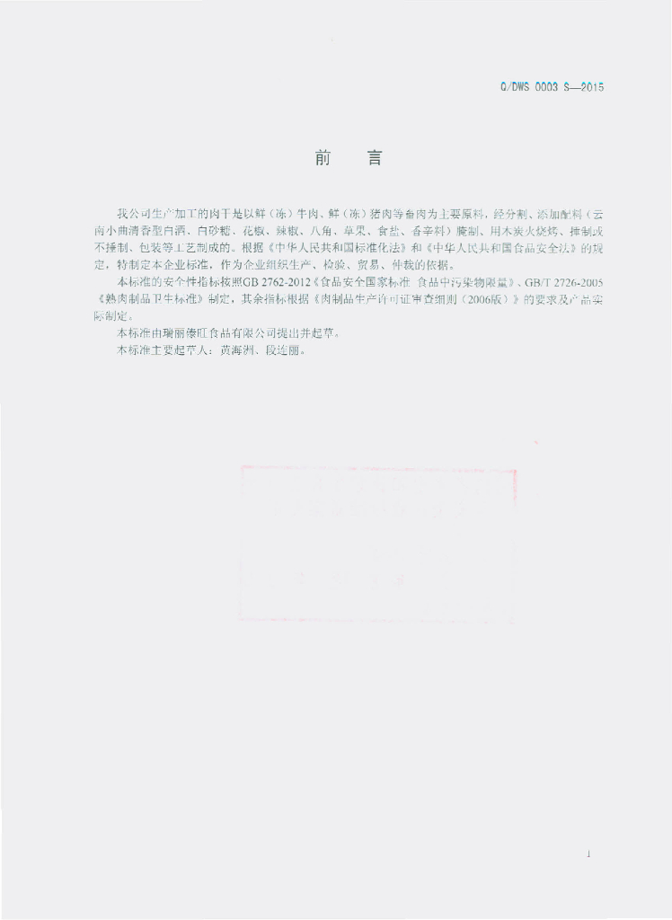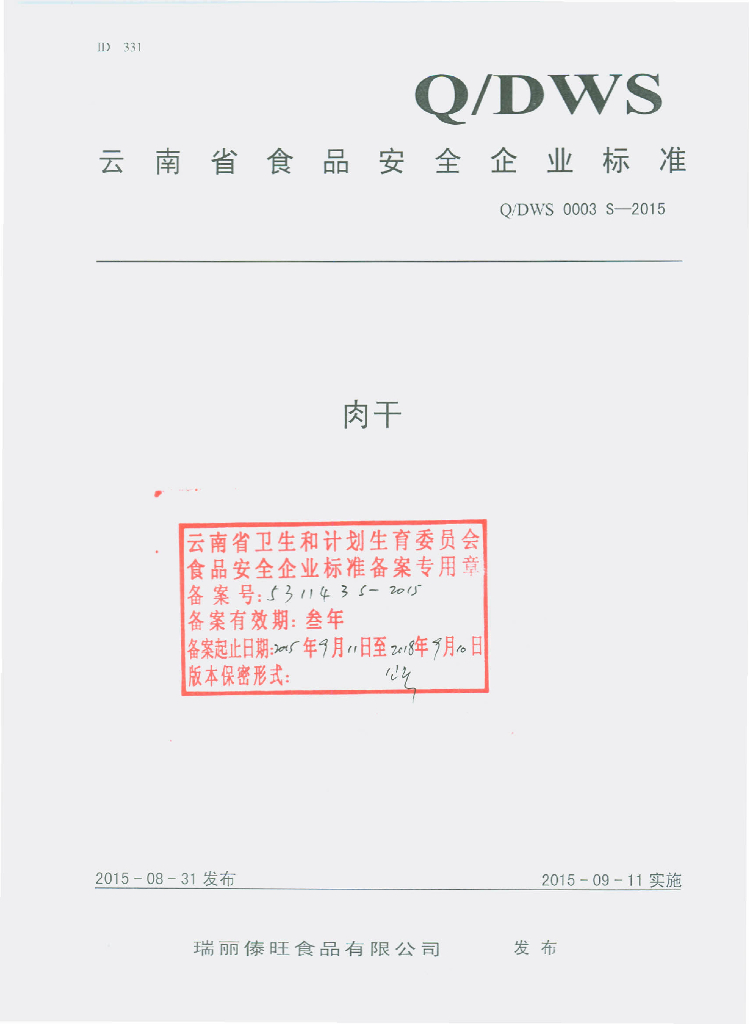 Q/DWS 0003S-2015 瑞丽傣旺食品有限公司 肉干