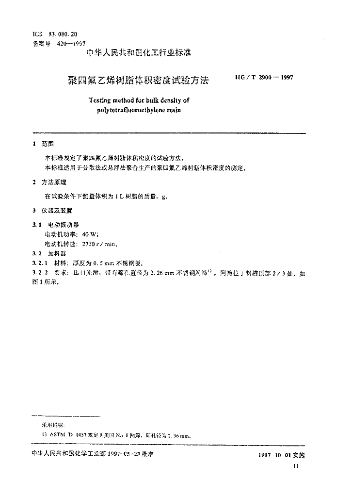 HG/T 2900-1997 聚四氟乙烯树脂体积密度试验方法
