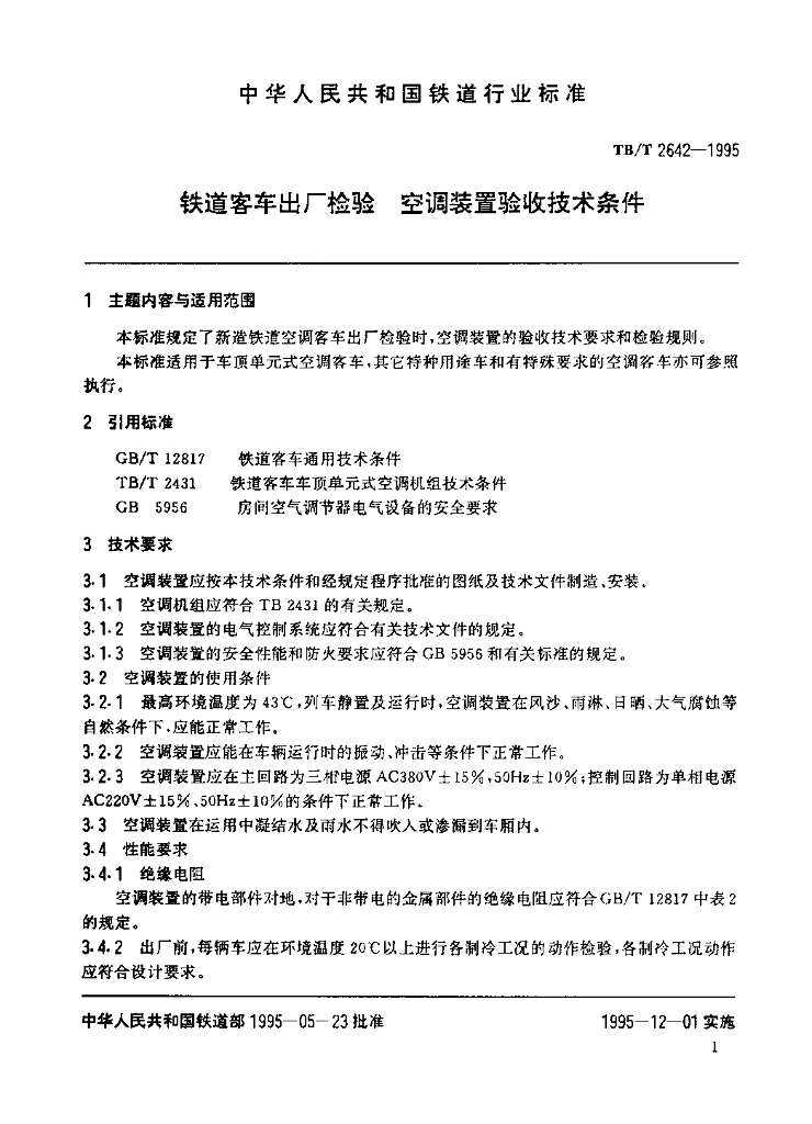 TB/T 2642-1995 铁道客车出厂检验空调装置验收技术条件
