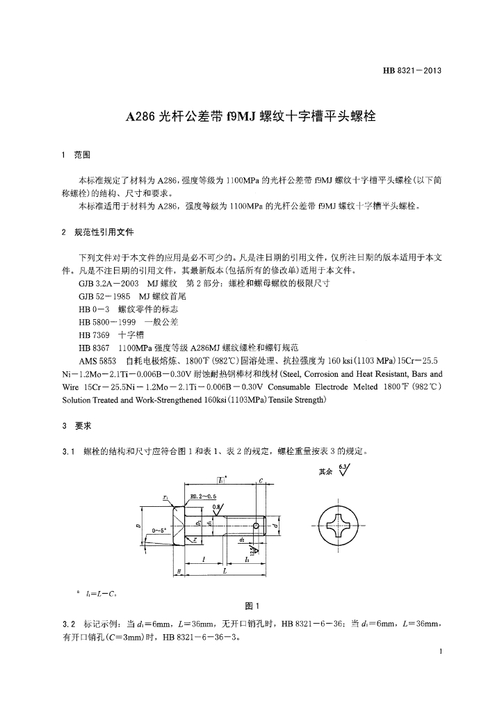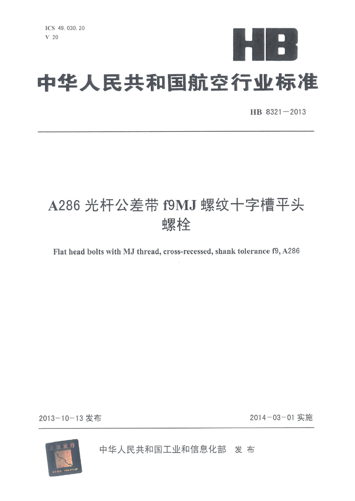 HB 8321-2013 A286光杆公差带 f9MJ螺纹十字槽平头螺栓