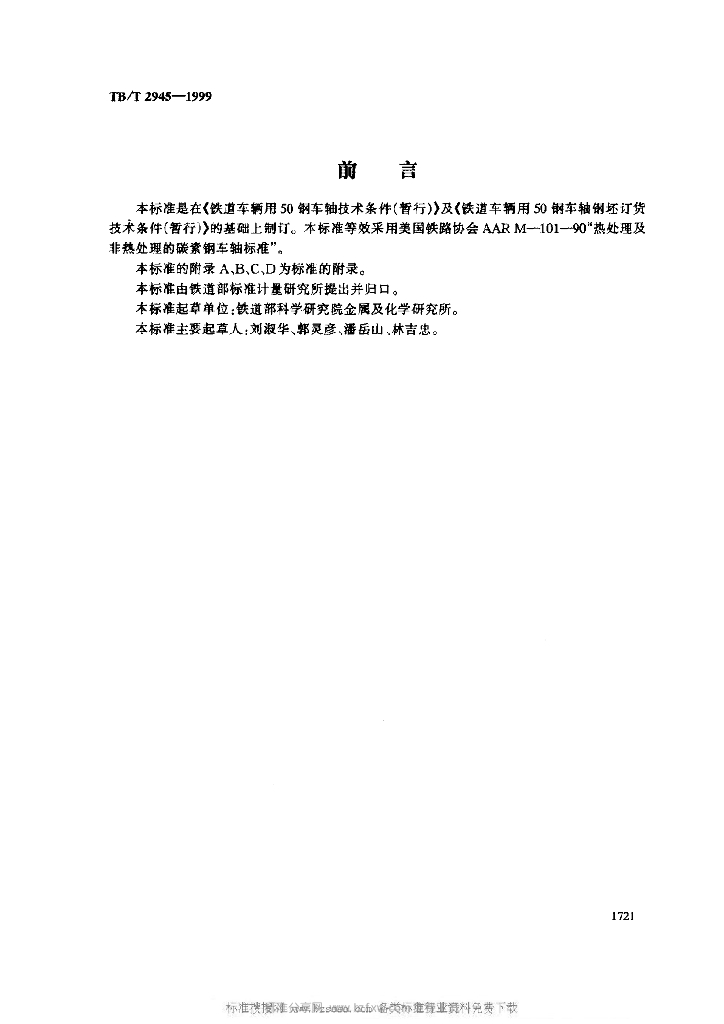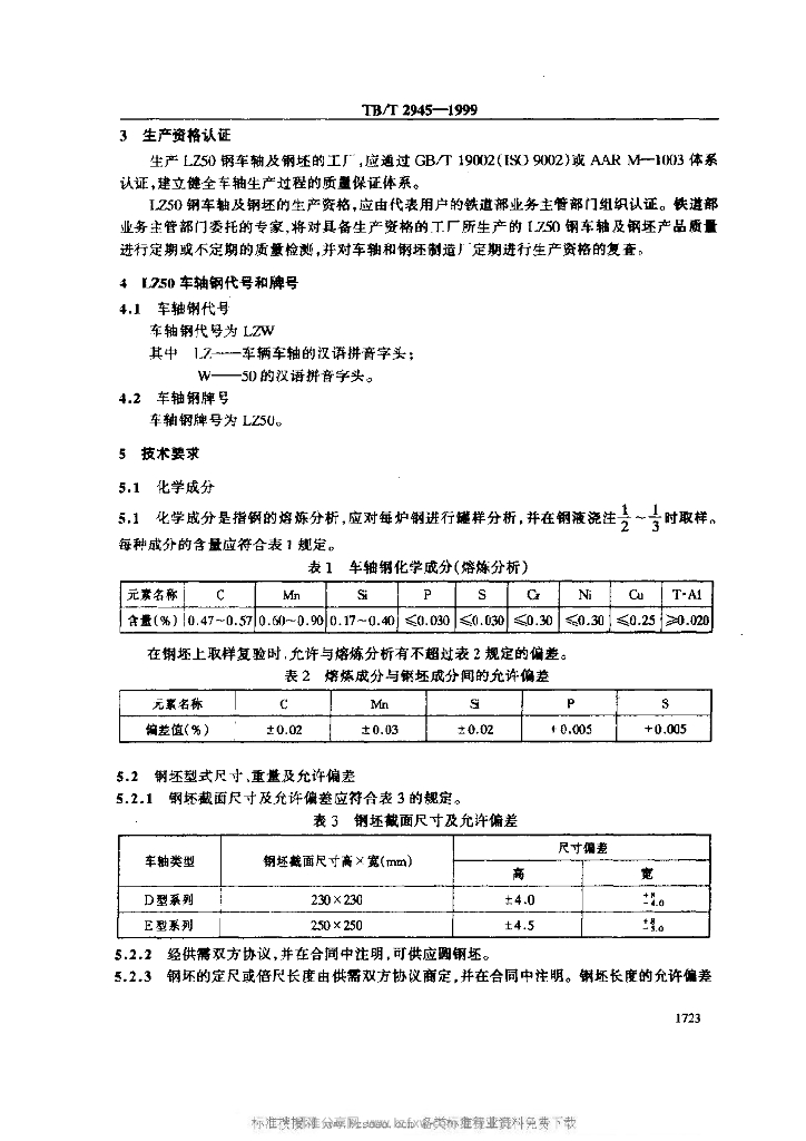 TB/T 2945-1999 铁道车辆用LZ50钢车轴及钢坯技术条件