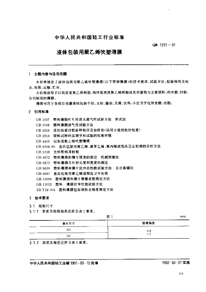 QB/T 1231-1991 液体包装用聚乙烯吹塑薄膜