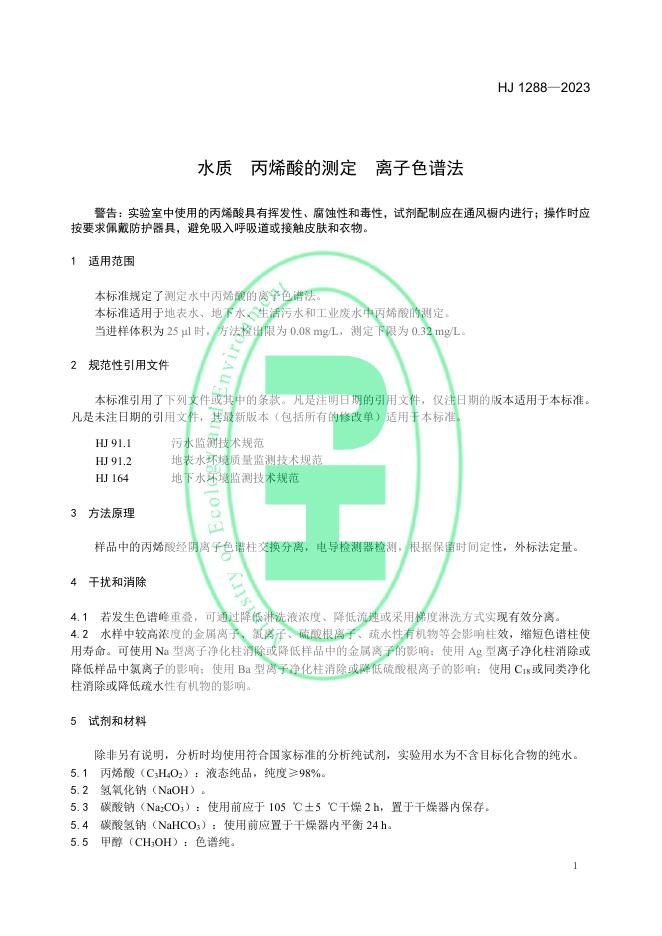 HJ 1288-2023 水质 丙烯酸的测定 离子色谱法