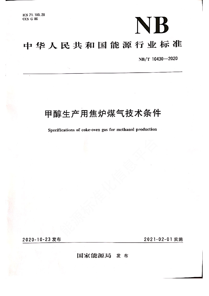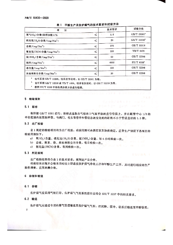 NB/T 10430-2020 甲醇生产用焦炉煤气技术条件