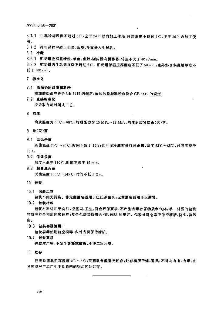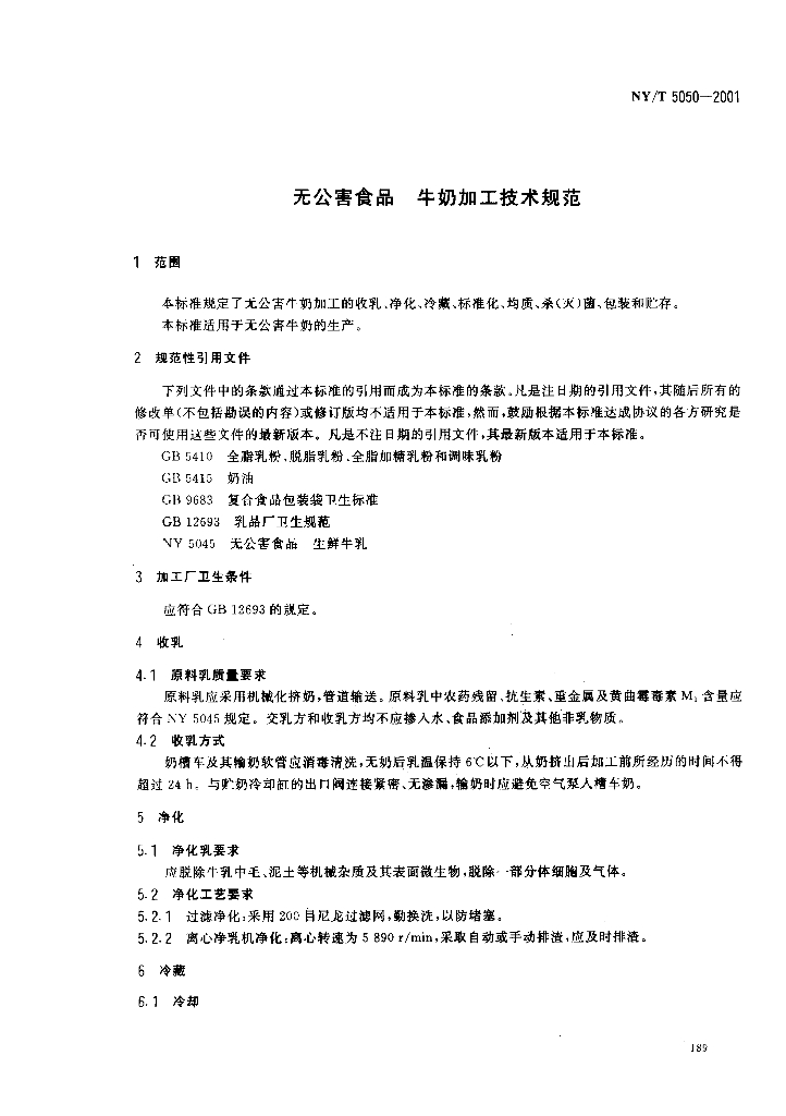 NY/T 5050-2001 无公害食品 牛奶加工技术规范
