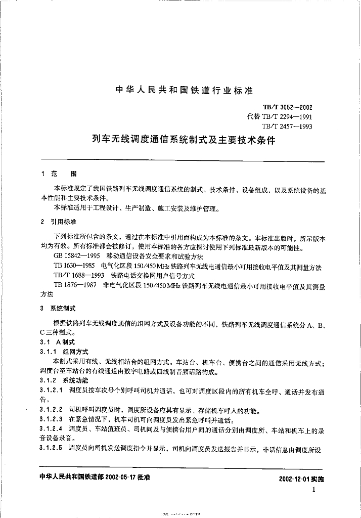 TB/T 3052-2002 列车无线调度通信系统制式及主要技术条件