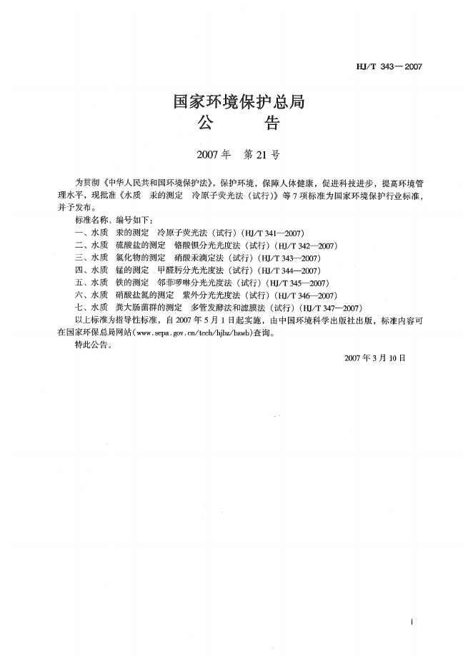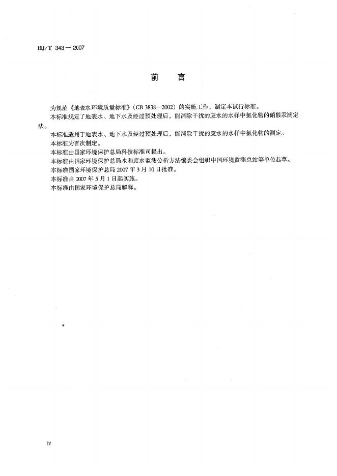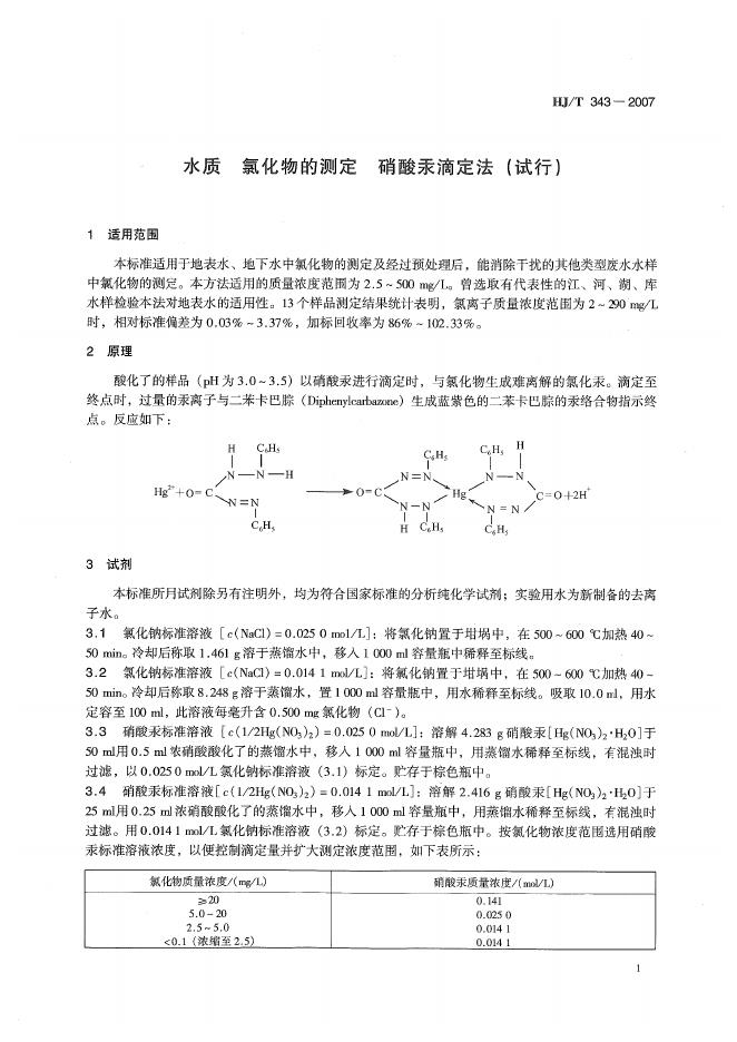 HJ/T 343-2007 水质 氯化物的测定 硝酸汞滴定法(试行)