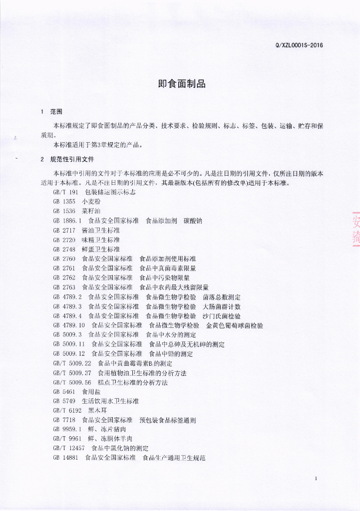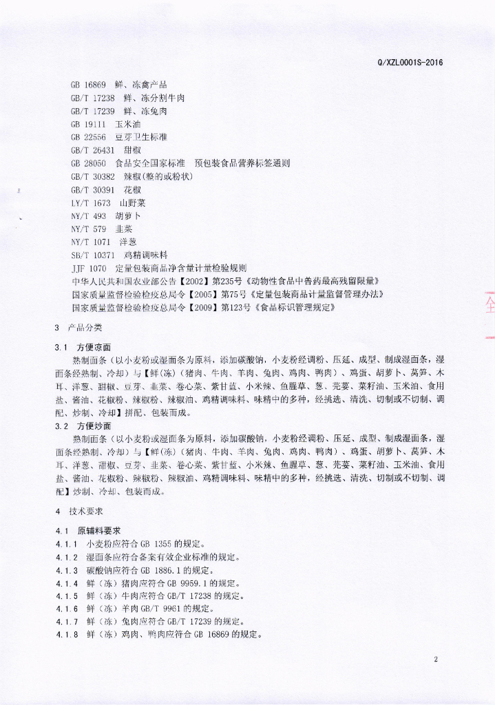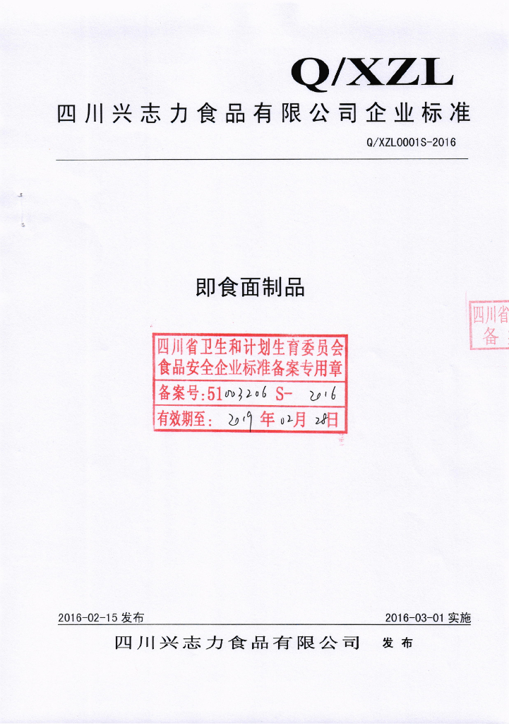 Q/XZL 0001S-2016 四川兴志力食品有限公司 即食面制品