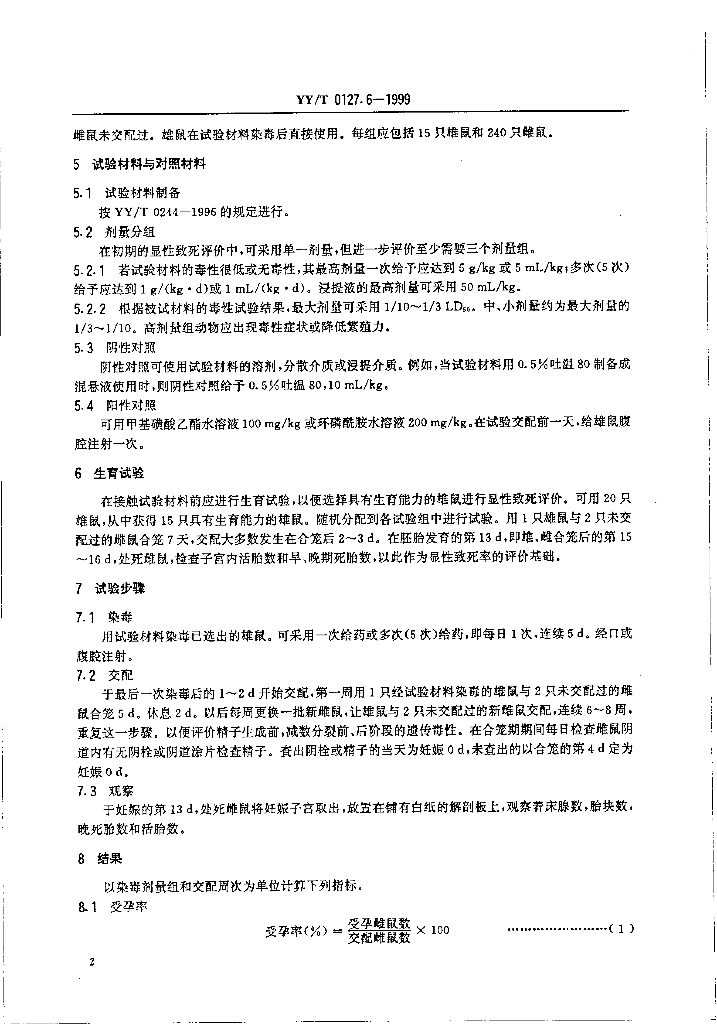 YY/T 0127.6-1999 口腔材料生物学评价 第2单元:口腔材料生物试验方法显性致死试验