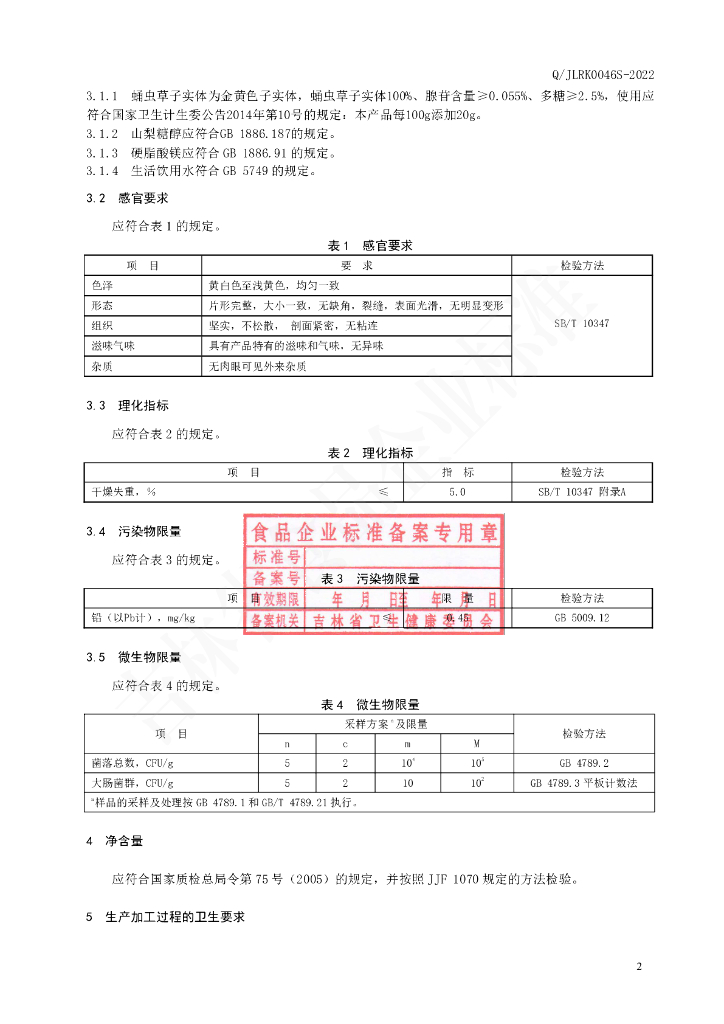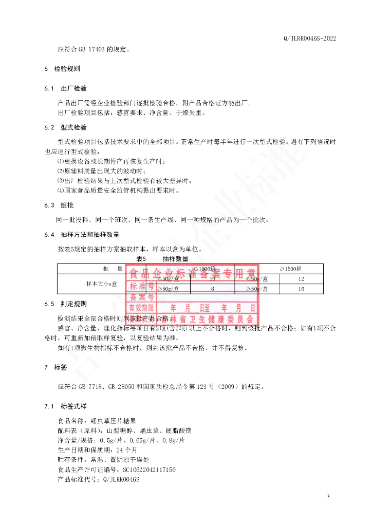 Q/JLRK 0046S-2022 蛹虫草压片糖果