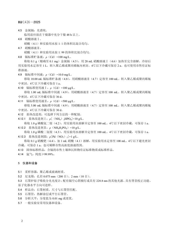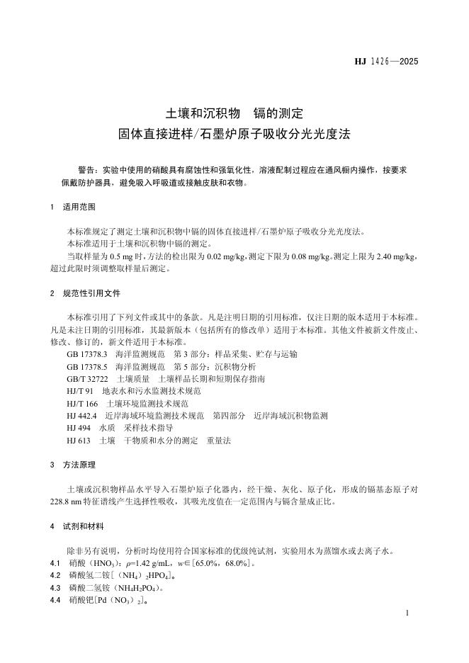 HJ 1426-2025 土壤和沉积物 镉的测定 固体直接进样 石墨炉原子吸收分光光度法