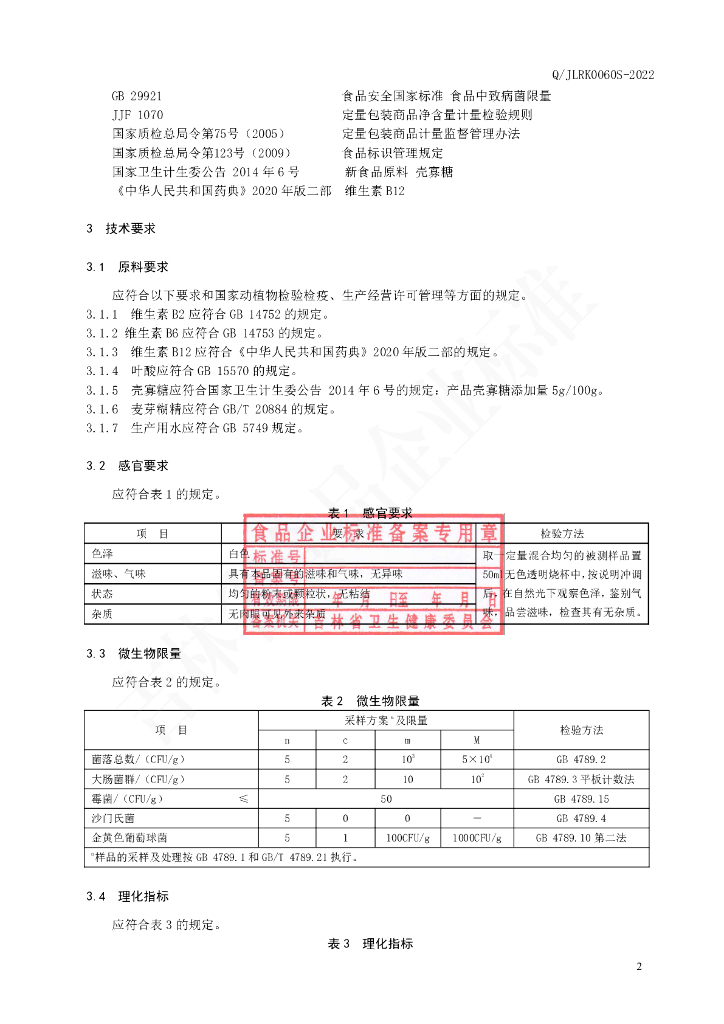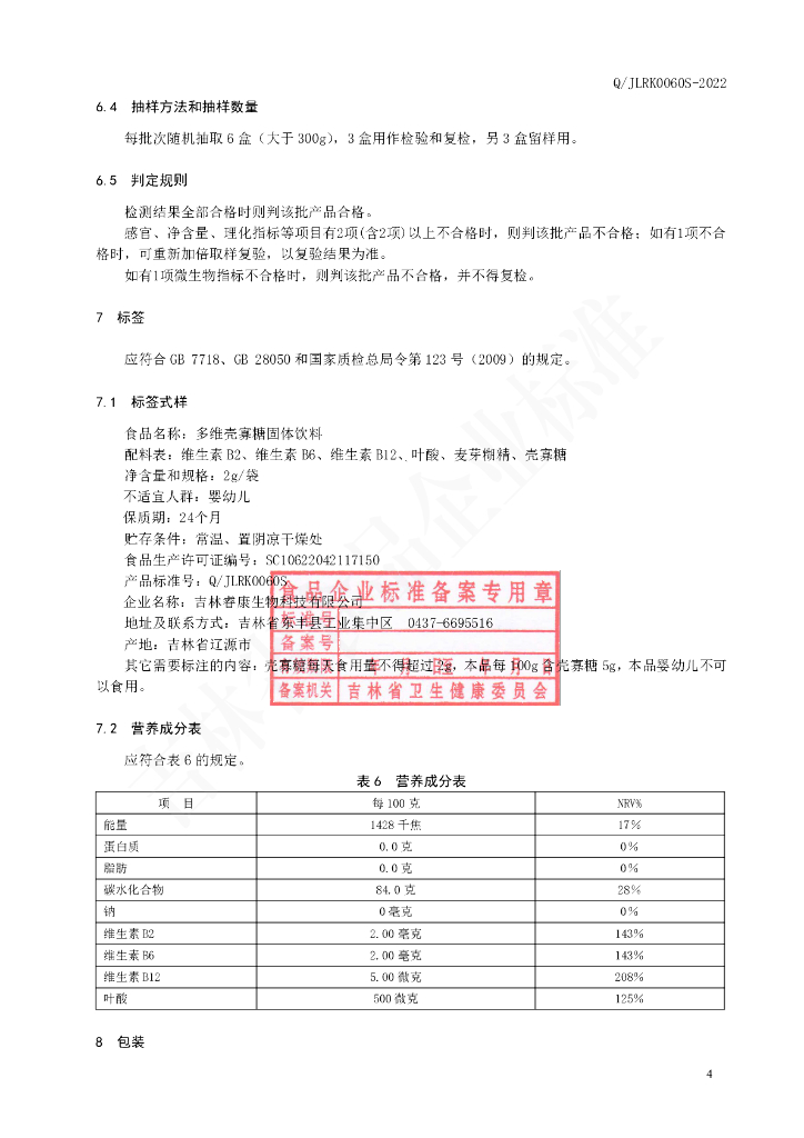 Q/JLRK 0060S-2022 多维壳寡糖固体饮料
