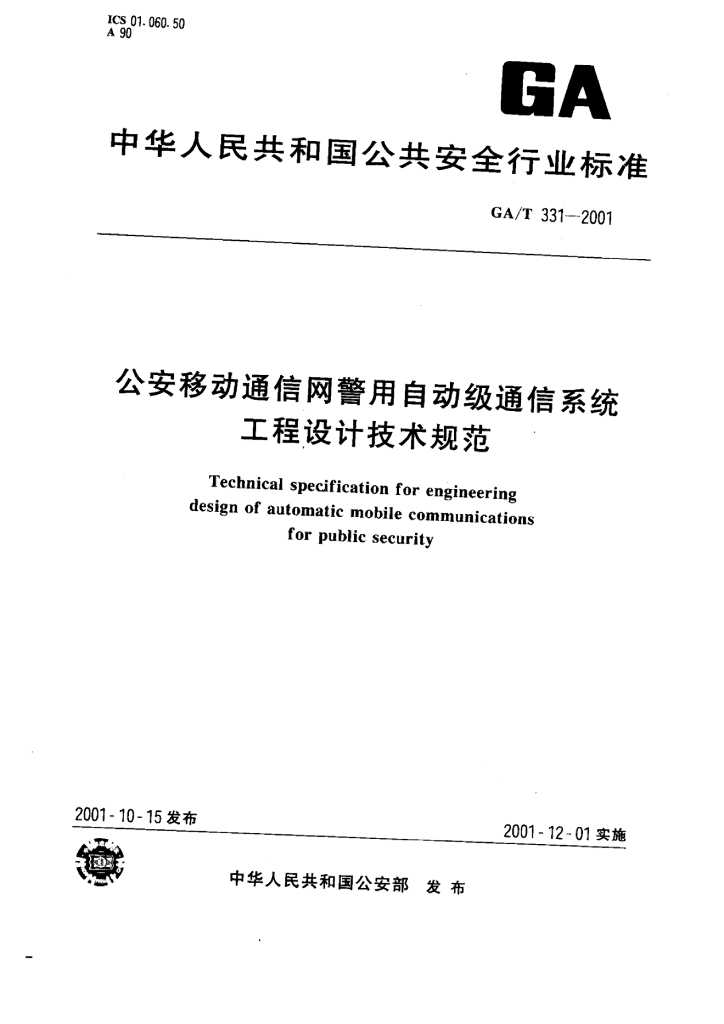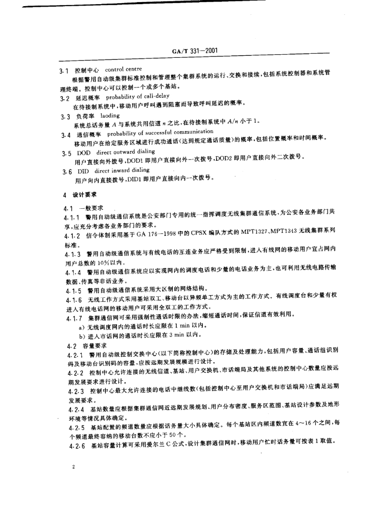 GA/T 331-2001 公安移动通信网警用自动级通信系统工程设计技术规范