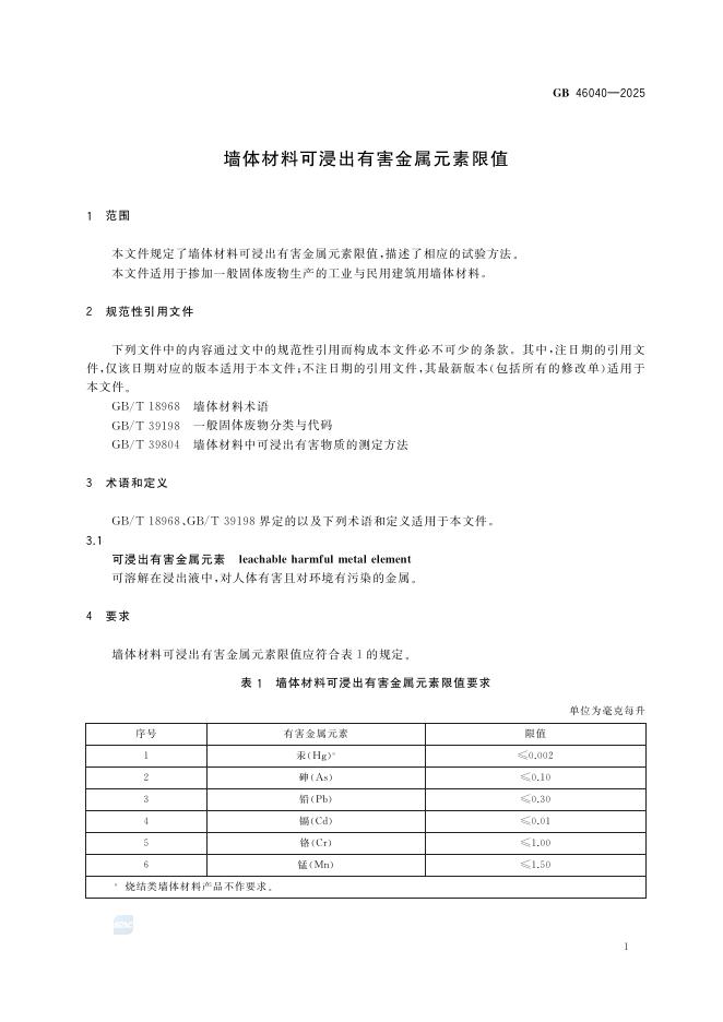 GB 46040-2025 墙体材料可浸出有害金属元素限值