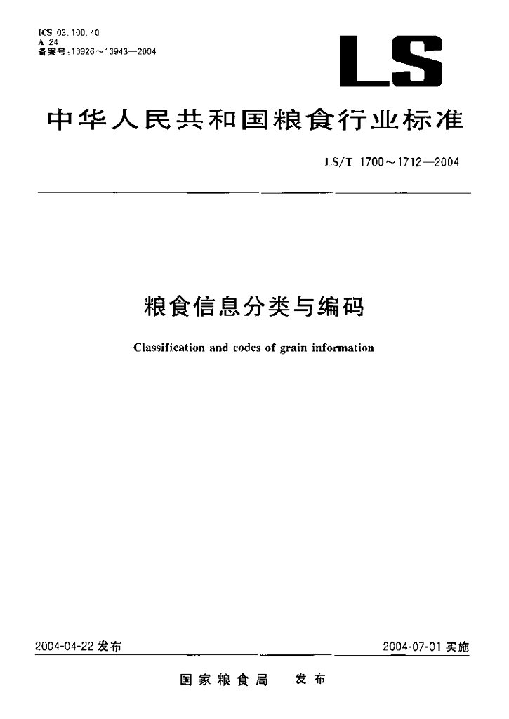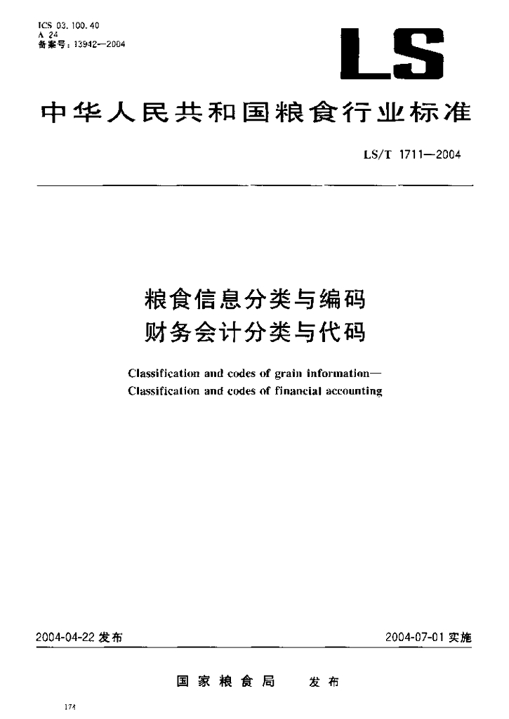LS/T 1711-2004 粮食信息分类与编码 财务会计分类与代码