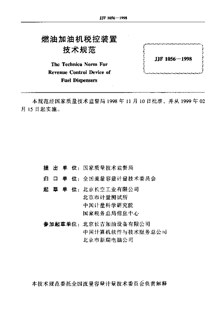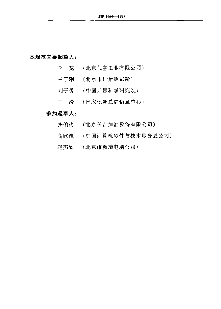 李宽(北京长空工业有限公司)、王子刚(北京市计量测试所)、刘子勇(中国计量科学研究院)、王浩(国家税务总局信息中心)、张伯南(北京长吉加油设备有限公司)、高欣维(中国计算机软件与技术服务总公司)、赵杰欣(北京市新瑞电脑公司)