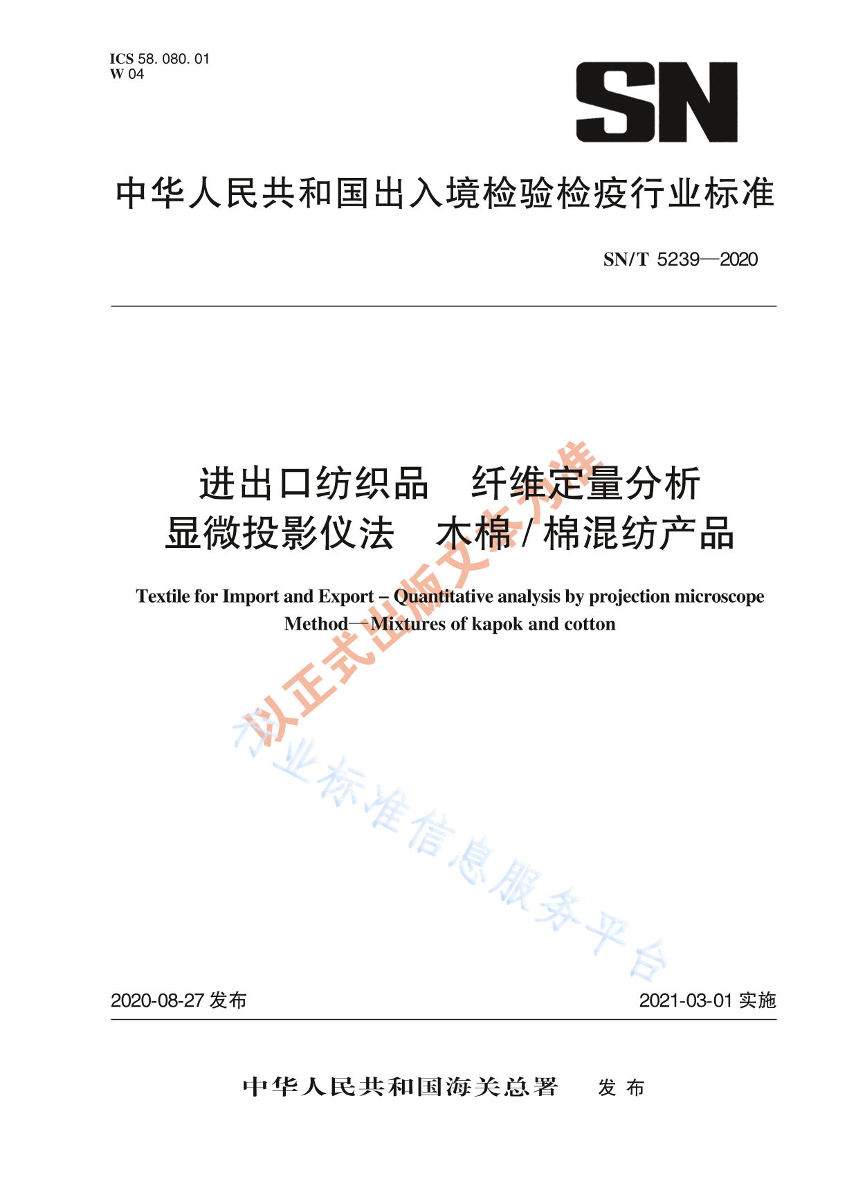 SN/T 5239-2020 进出口纺织品 纤维定量分析 显微投影仪法 木棉/棉混纺产品?