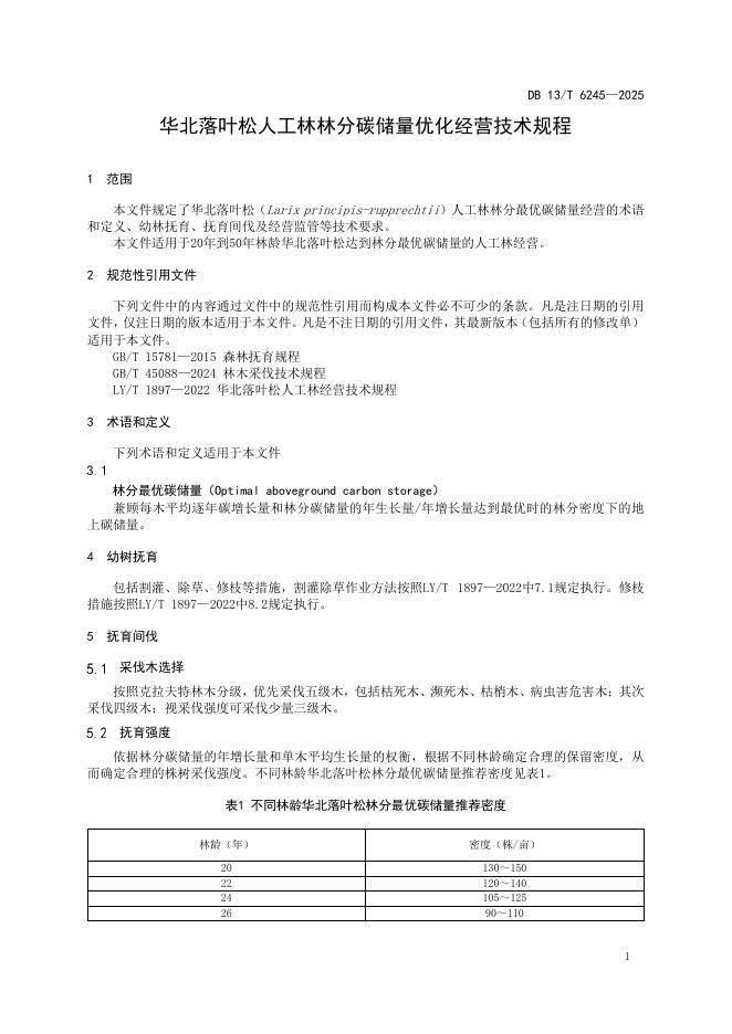 DB13/T 6245-2025 华北落叶松人工林林分碳储量优化经营技术规程