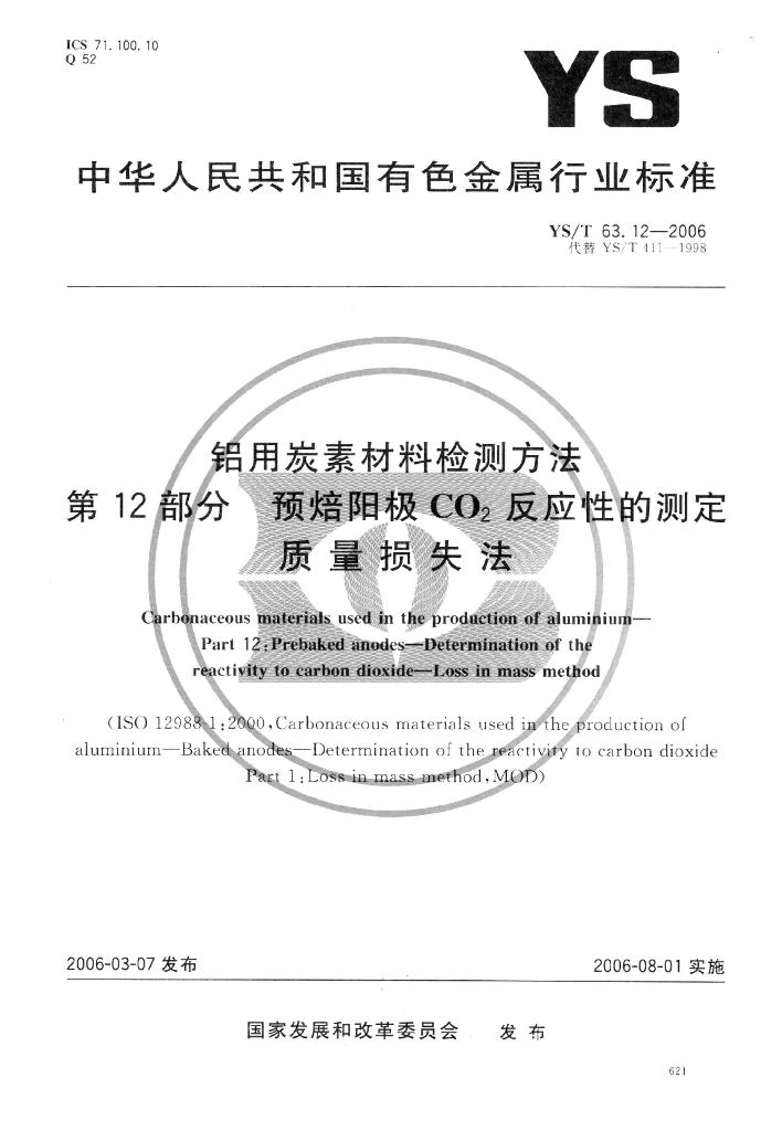 YS/T 63.12-2006 铝用炭素材料检测方法 第12部分:预焙阳极CO2 反应性的测定 质量损失法