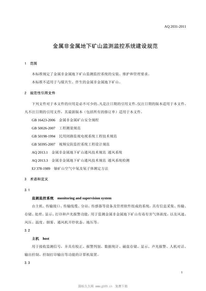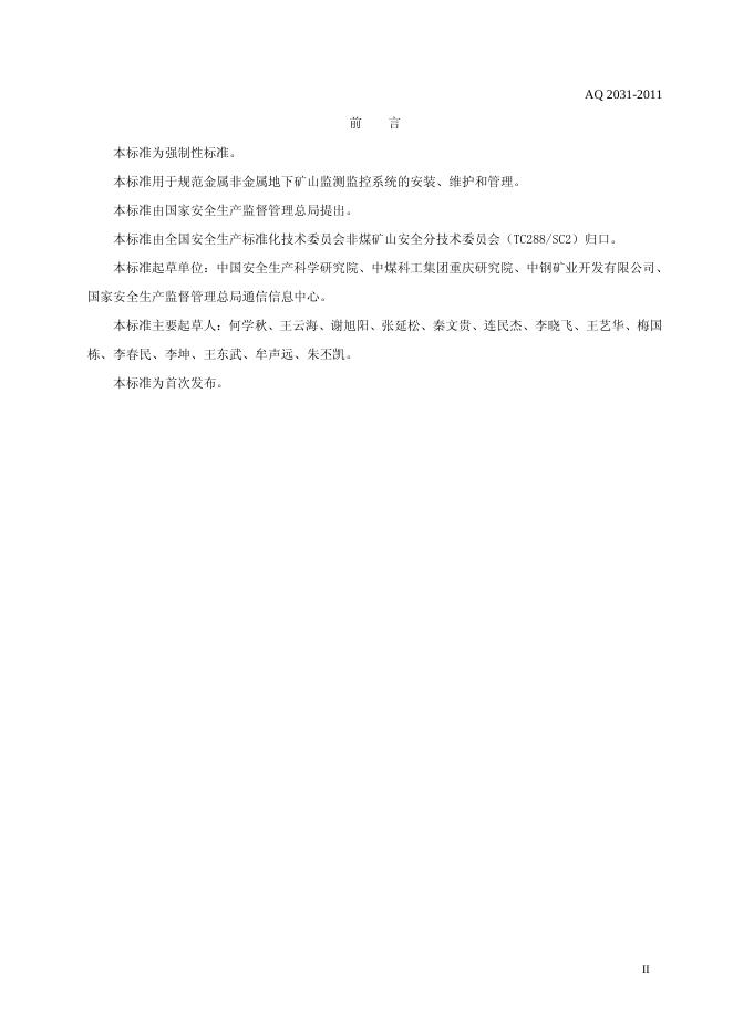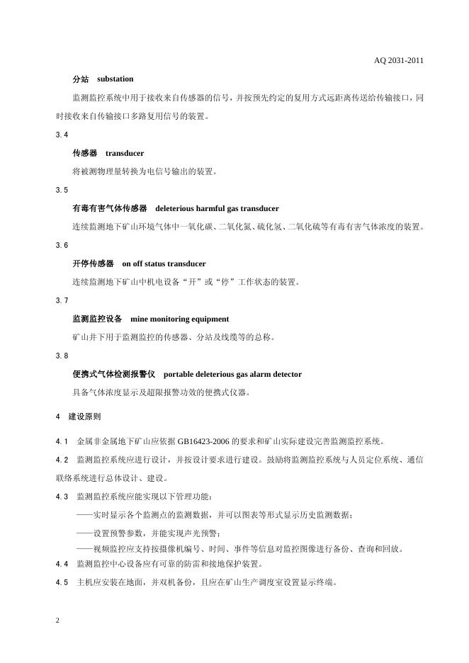 AQ 2031-2011 金属非金属地下矿山监测监控系统建设规范