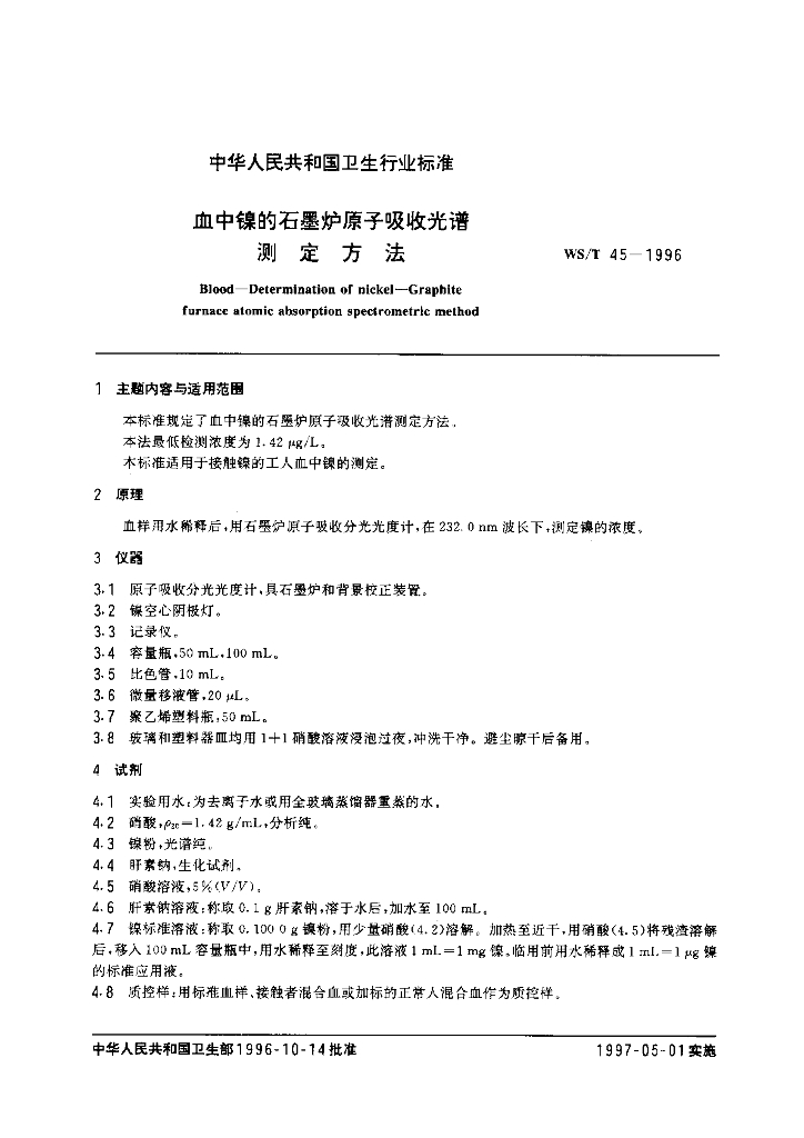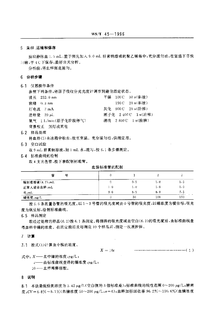 WS/T 45-1996 血中镍的石墨炉原子吸收光谱测定方法