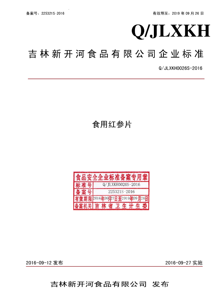 Q/JLXKH 0026S-2016 吉林新开河食品有限公司 食用红参片