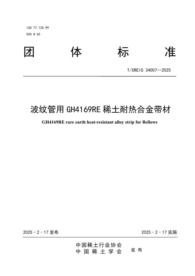 T/CREIS 34007-2025 波纹管用GH4169RE稀土耐热合金带材