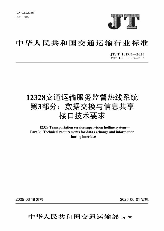 JT/T 1019.3-2025 12328交通运输服务监督热线系统 第3部分:数据交换与信息共享接口技术要求