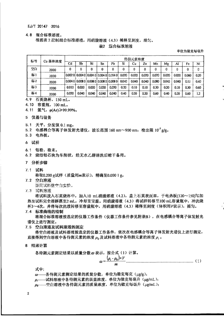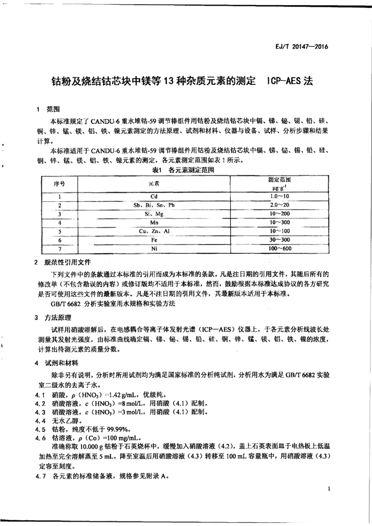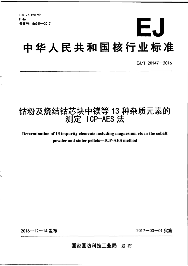 EJ/T 20147-2016 钴粉及烧结钴芯块中镁等13种杂质元素的测定 ICP-AES法