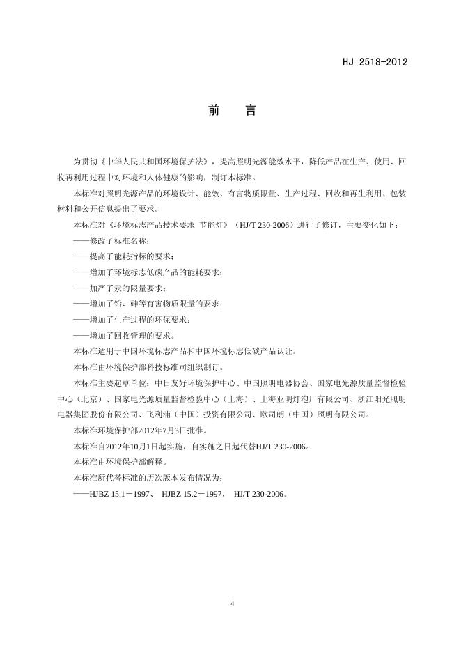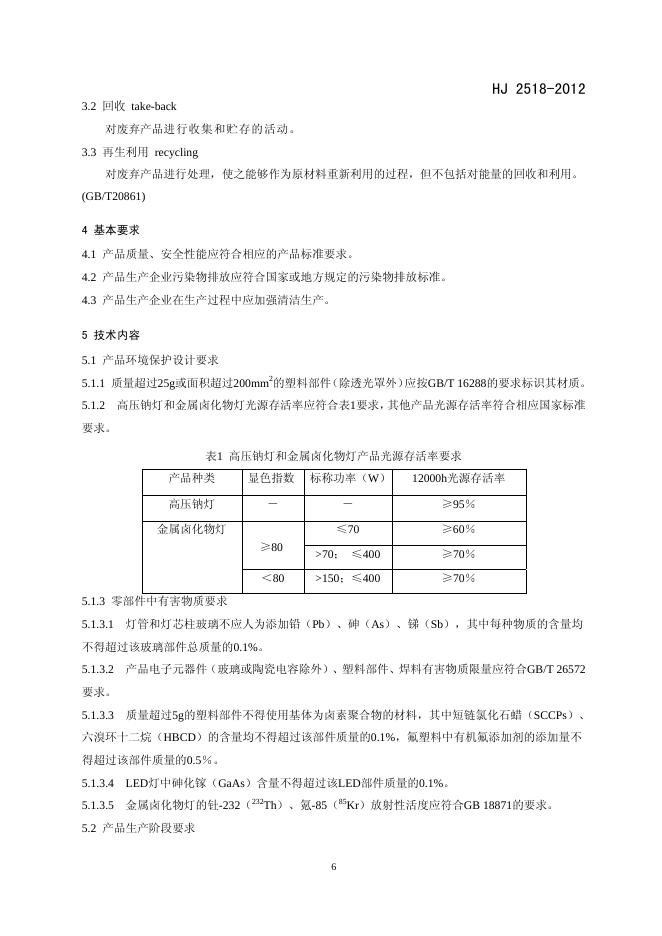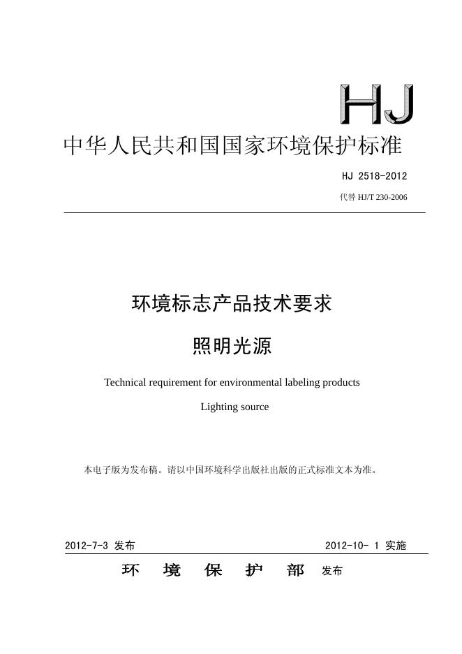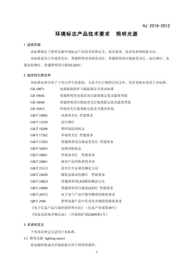 HJ 2518-2012 环境标志产品技术要求 照明光源
