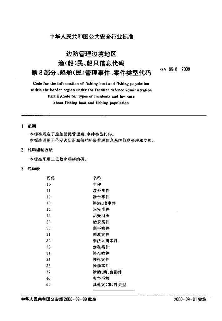 GA 99.8-2000 边防管理边境地区 渔(船)民、船只信息代码 第8部分:船舶(民) 管理事件、案件类型代码