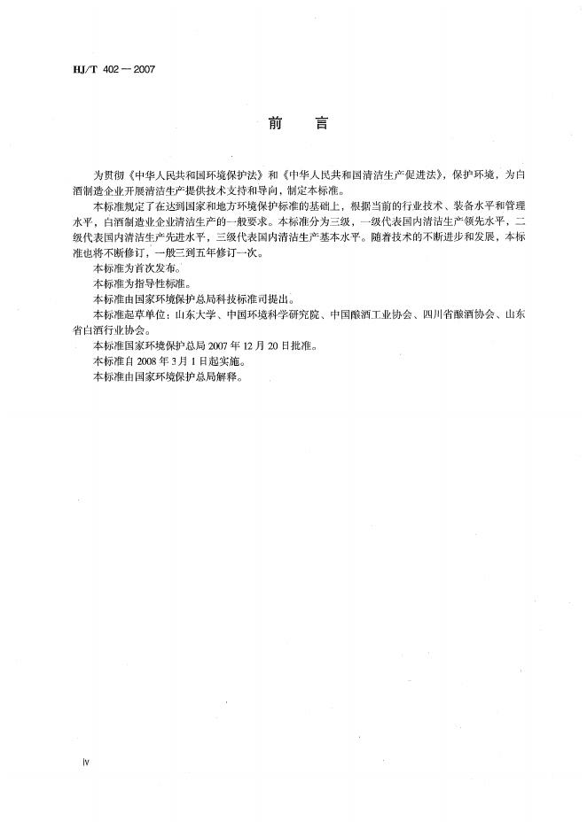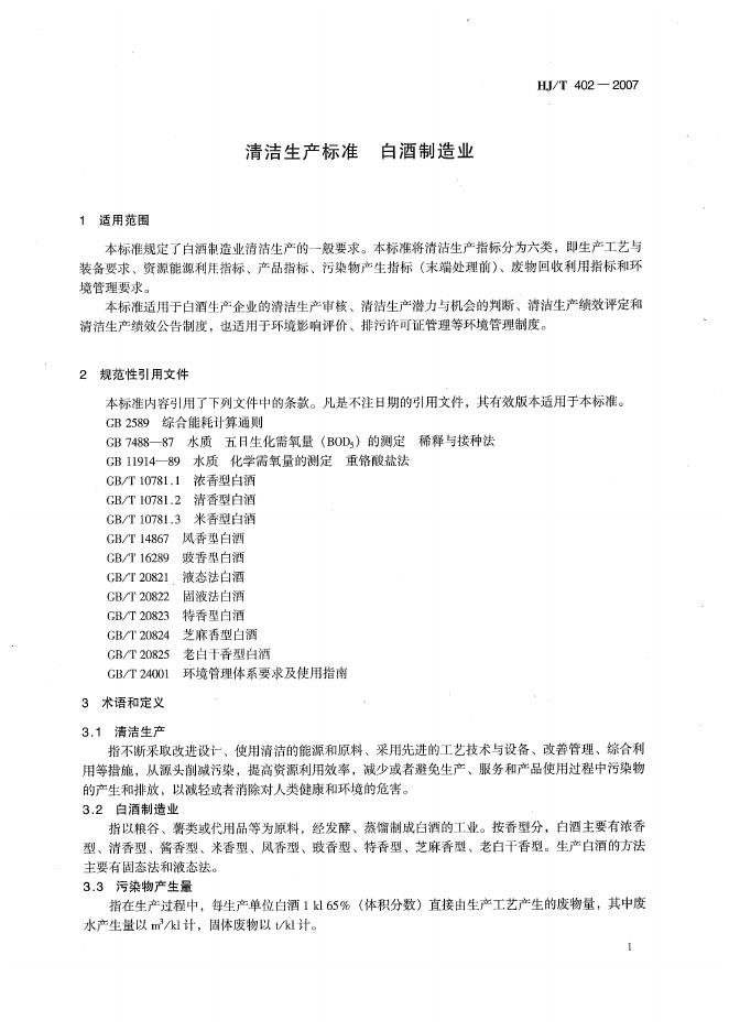 HJ/T 402-2007 清洁生产标准? 白酒制造业