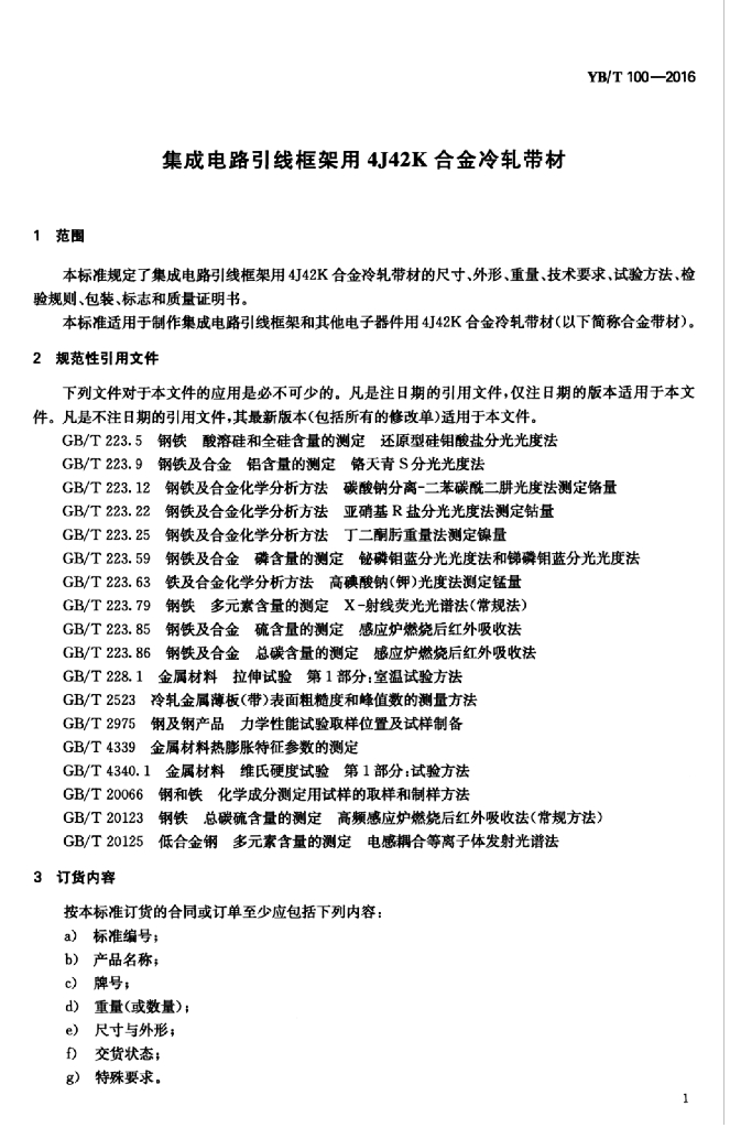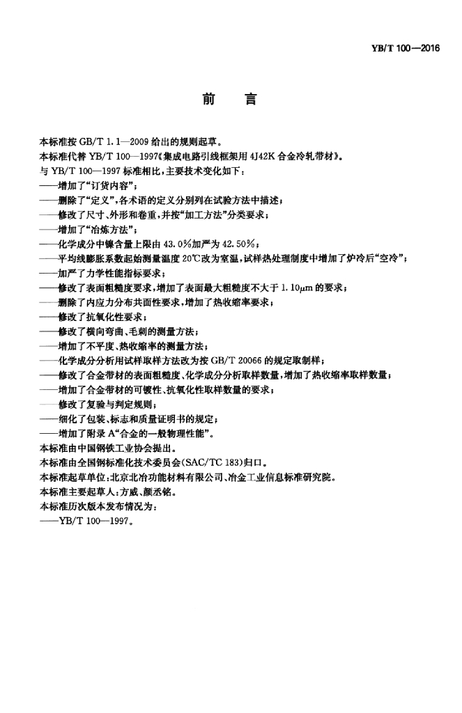 YB/T 100-2016 集成电路引线框架用4J42K合金冷轧带材