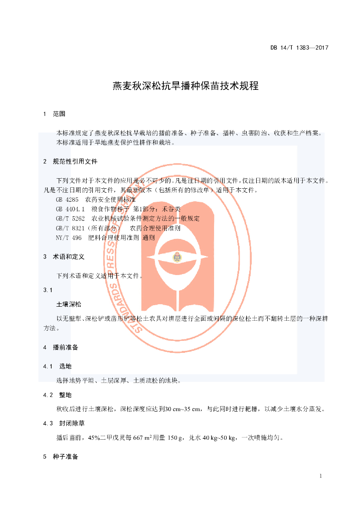 DB14/T 1383-2017 燕麦秋深松抗旱播种保苗技术规程