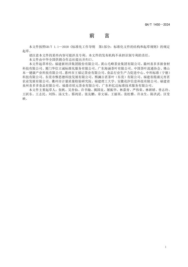 福建新坦洋集团股份有限公司、黄山毛峰茶业集团有限公司、滁州喜多多新食材科技有限公司、厦门华信立诚标准化服务有限公司、广东海涵茶叶有限公司、中国茶叶流通协会、佛山本一健康产业科技有限公司、惠州市王福记茶业有限公司、食品行业生产力促进中心、中科标准(宁德)科技有限公司、东莞市惟思德科技发展有限公司、熙澜古茗茶叶(东莞)有限公司、福建省霞浦元宵茗农业发展有限公司、衢州市计量质量检验研究院、福建理工大学、安徽花汐信息科技有限公司、福建省泉州喜多多食品有限公司、福鼎市状元茶业有限公司、广东科亿达标准技术服务有限公司