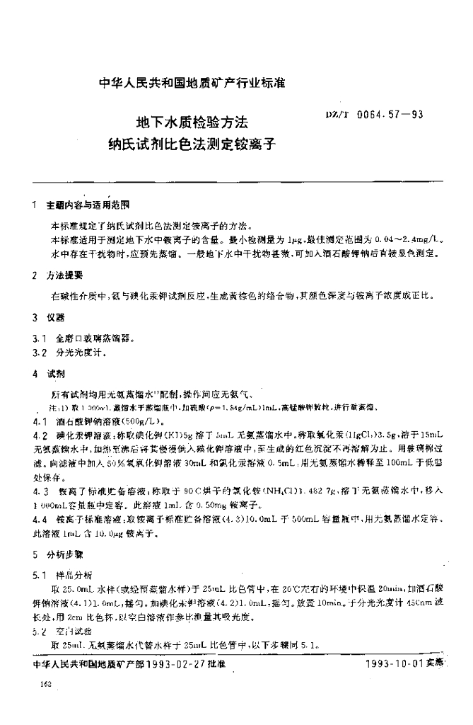 DZ/T 0064.57-1993 地下水质检验方法 纳氏试剂比色法测定铵离子