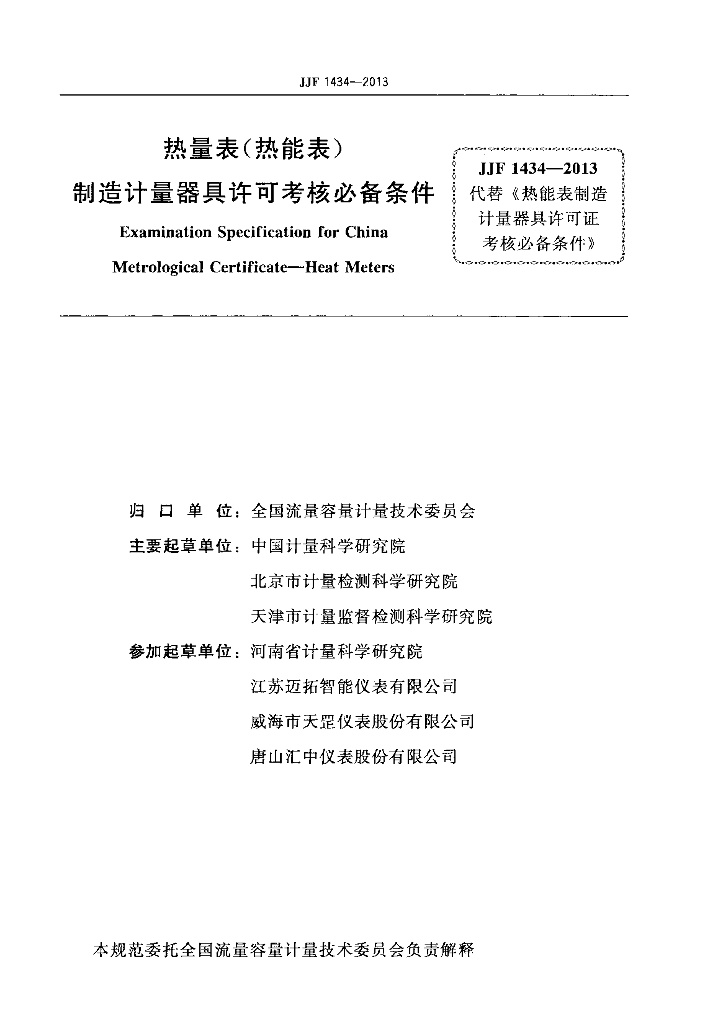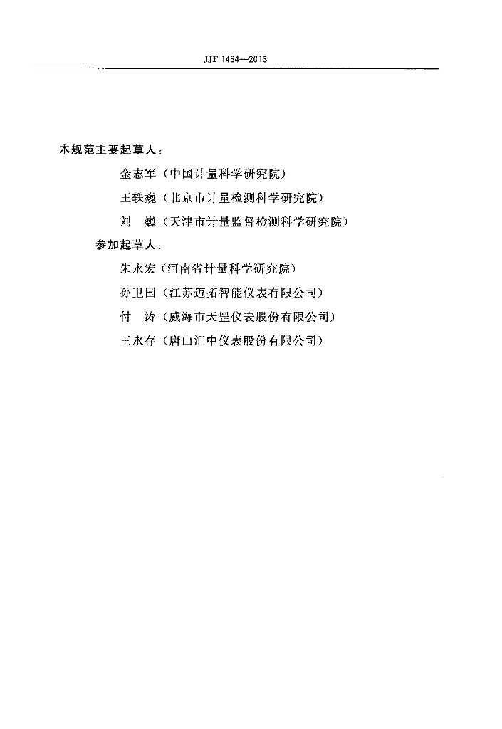 金志军(中国计量科学研究院)、王轶巍(北京市计量检测科学研究院)、刘巍(天津市计量监督检测科学研究院)、朱永宏(河南省计量科学研究院)、孙卫国(江苏迈拓智能仪表有限公司)、付涛(威海市天罡仪表股份有限公司)、王永存(唐山汇中仪表股份有限公司)