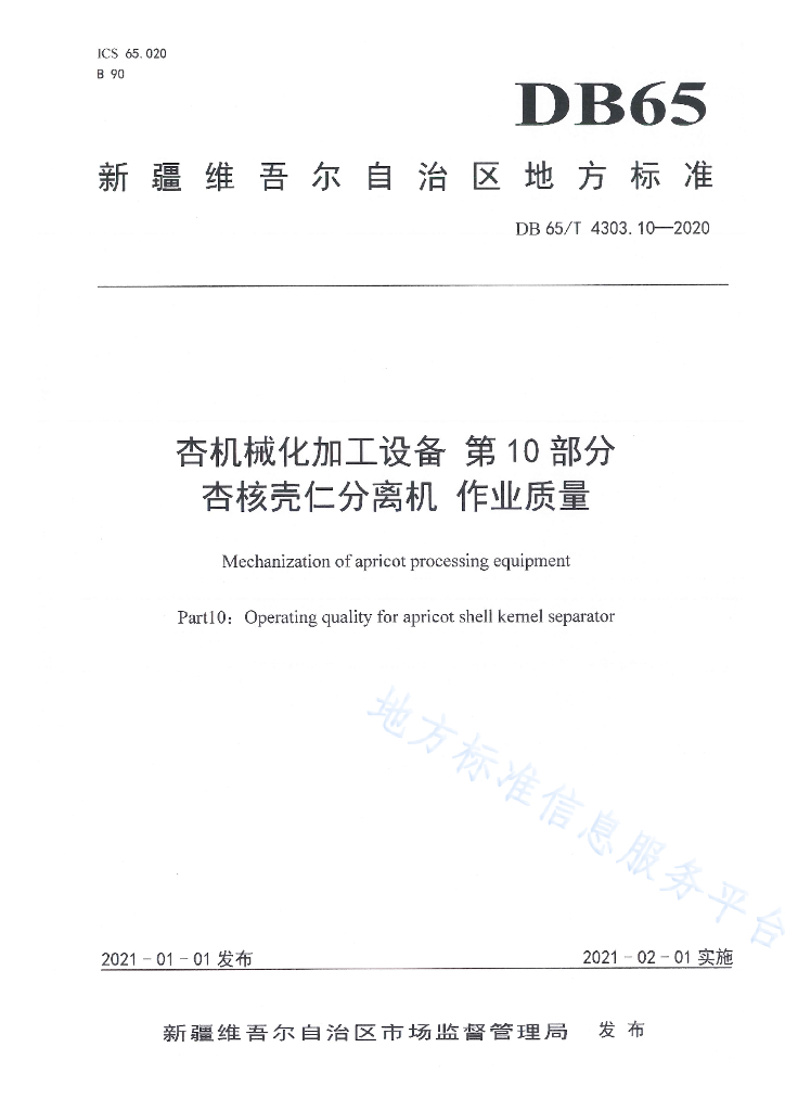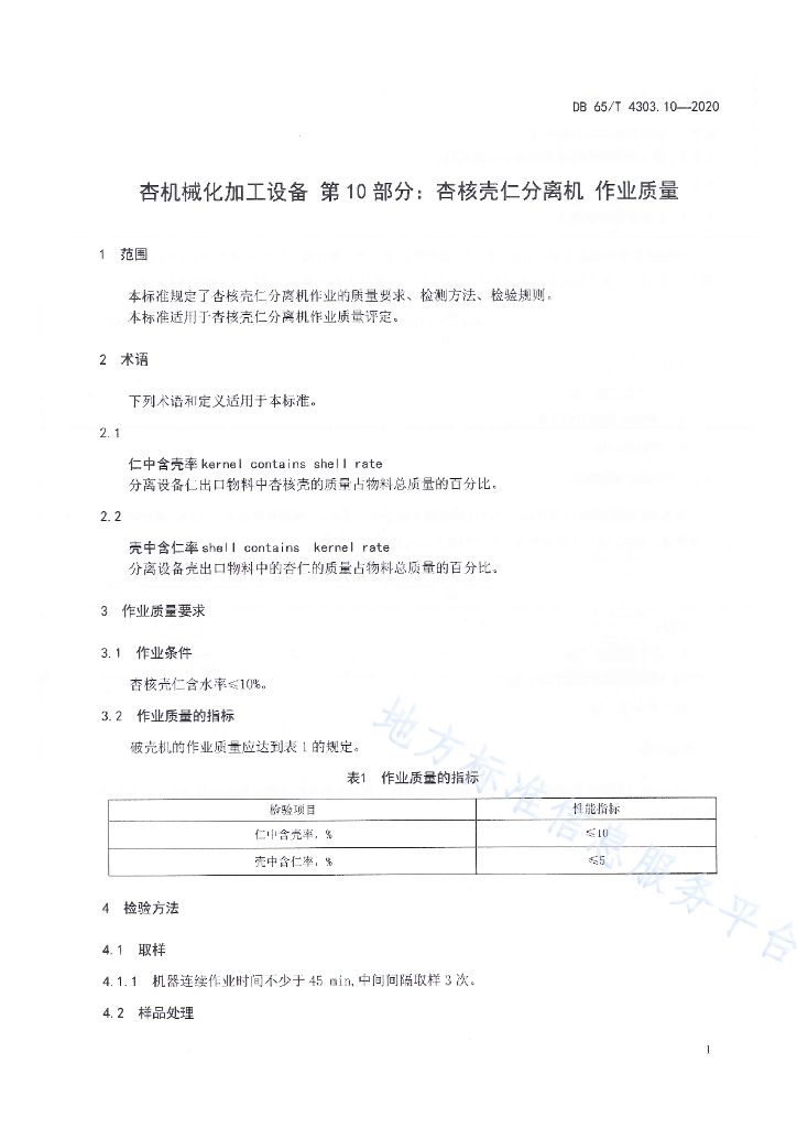 DB65/T 4303.10-2020 杏机械化加工设备 第10部分:杏核壳仁分离机 作业质量