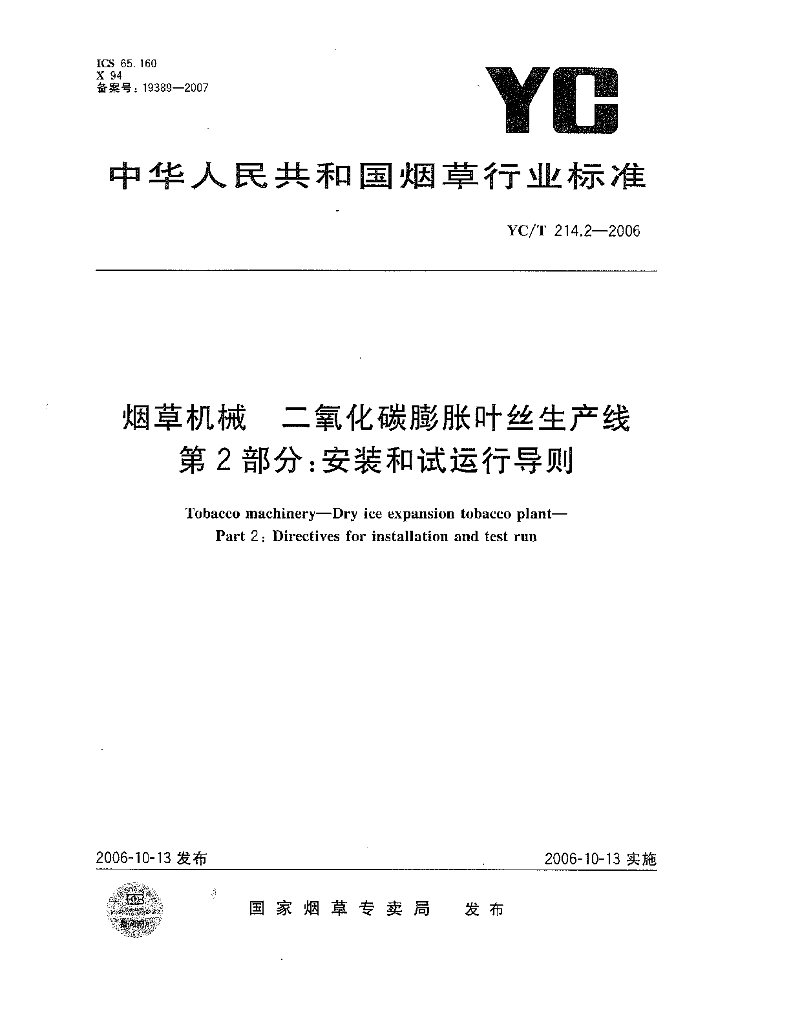 YC/T 214.2-2006 烟草机械 二氧化碳膨胀叶丝生产线 第2部分:安装和试运行导则