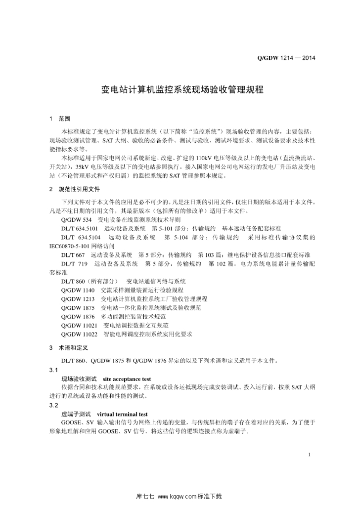 Q/GDW 1214-2014 变电站计算机监控系统现场验收管理规程
