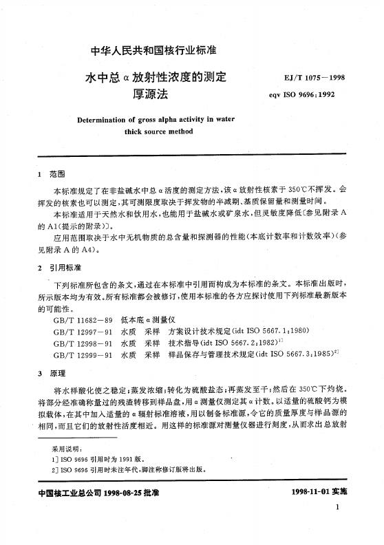 EJ/T 1075-1998 水中总α放射性浓度的测定 厚源法