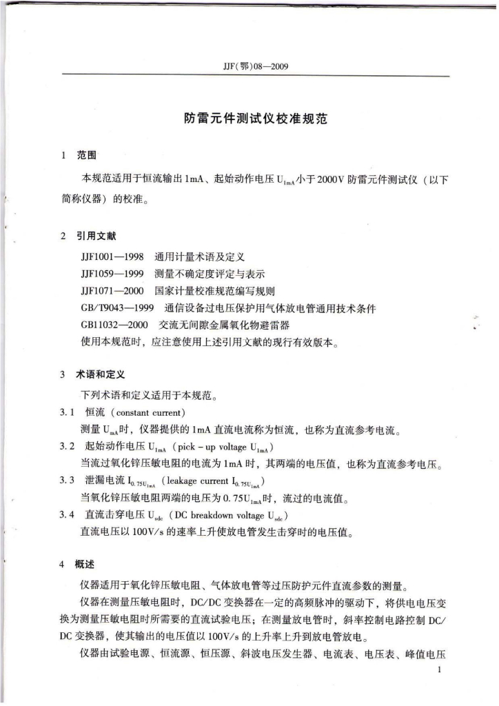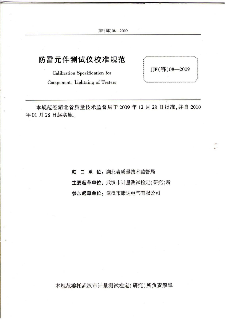 JJF(鄂)08-2009 防雷元件测试仪校准规范